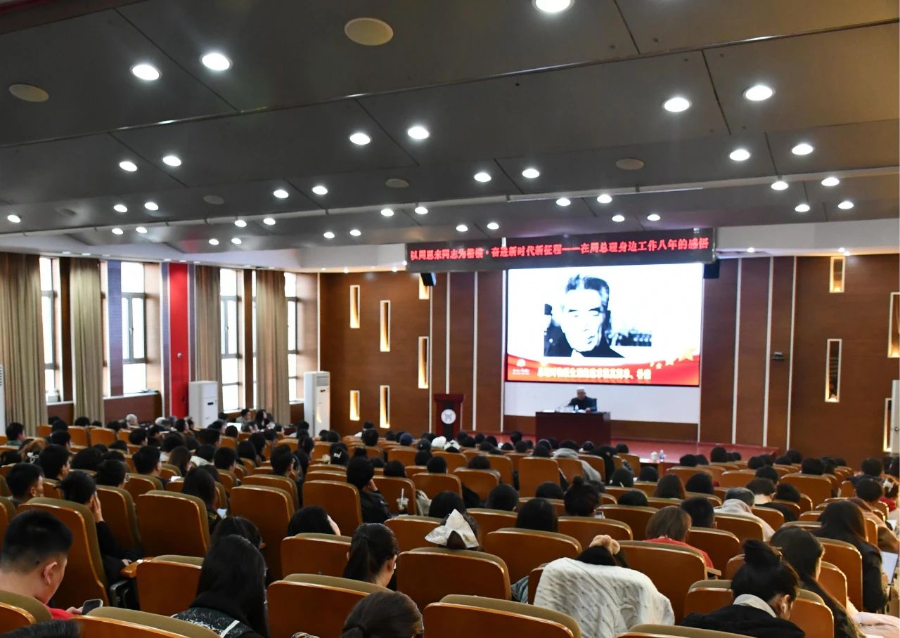 纪将军的讲座深刻且感人至深,他以不忘初心、坚定不移的理想信念为核心,深情阐述了周恩来总理心系人民、甘当人民公仆的崇高精神境界,并通过总理持之以恒、严于律己的道德修养展示,讲述了周总理以身作则、严谨自律的光辉形象,再结合鞠躬尽瘁、敢于担当的高尚品格,全方位、多角度地引领在场师生深入而细致地领略了这位深受人民爱戴的好总理的风采与魅力。纪将军从周总理的日常工作和生活点滴细节切入,利用珍贵的影像资料和历史照片,以及一系列细腻入微、触动人心的真实故事,向我们描绘了周恩来同志那光辉且伟大的一生。
