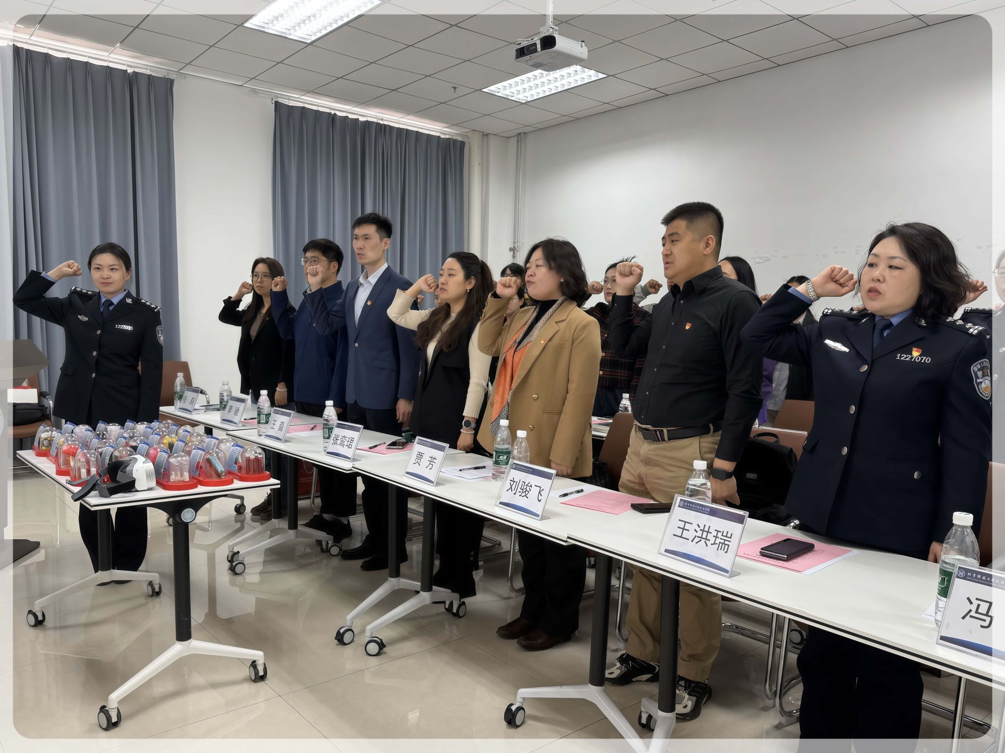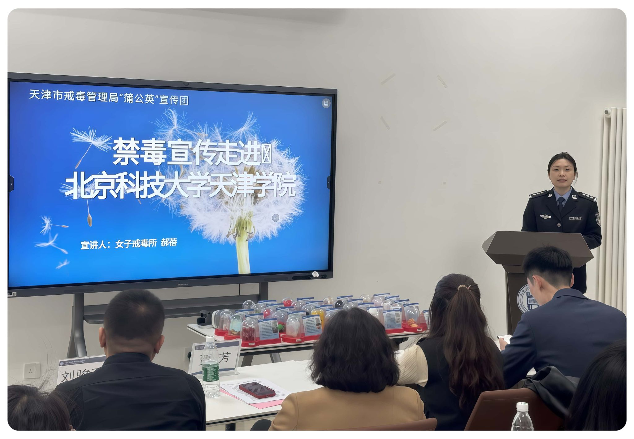 在禁毒宣传环节,天津市女子强制隔离戒毒所二大队警察郝蓓以“预防毒品,守护青春”为主题,结合其一线戒毒工作经验,向师生讲述了青少年误入歧途的真实故事,并强调“一次好奇可能毁掉一生,禁毒教育必须从认知到行动全面渗透”。宣誓环节,全体人员庄重起立,右手握拳,在领誓人的带领下郑重承诺,“我宣誓:珍爱生命,远离毒品,积极参与禁毒斗争……”铿锵有力的誓言回荡在会场。