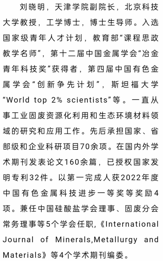 刘晓明教授主持完成的项目“电解锰渣中氨氮循环及多固废全组分协同利用研究与应用”获冶金科学技术奖一等奖。该项目针对电解锰渣残留氨氮、残余锰和粘性大等难题,提出了利用碱性固废回收锰渣中氨氮并制备氨水的新思路,并利用锰渣中锰氧化物对二噁英的催化降解和铵盐对二噁英的脱氯降解作用,协同实现了垃圾焚烧飞灰中二噁英的降解以及电解锰渣中氨氮的脱出、回收和循环利用。项目建立了“两设计、两效应”的固废材料化利用理论构架,成功制备出锰渣基中钙-硅铝质系列低碳材料,实现了电解锰渣的大规模无害化处置和资源化梯级利用。项目授权发明专利12项,发表论文77篇。该技术成功应用于贵州、广西等地,累计新增产值9.37亿元。